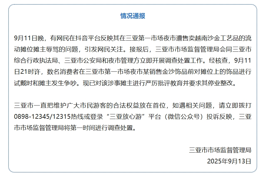 小编:9月13日中国新闻服务,Sanya市场监督办公室于9月13日发布了州通知:9月11日晚上,一些互联网用户在Douyin平台上报告